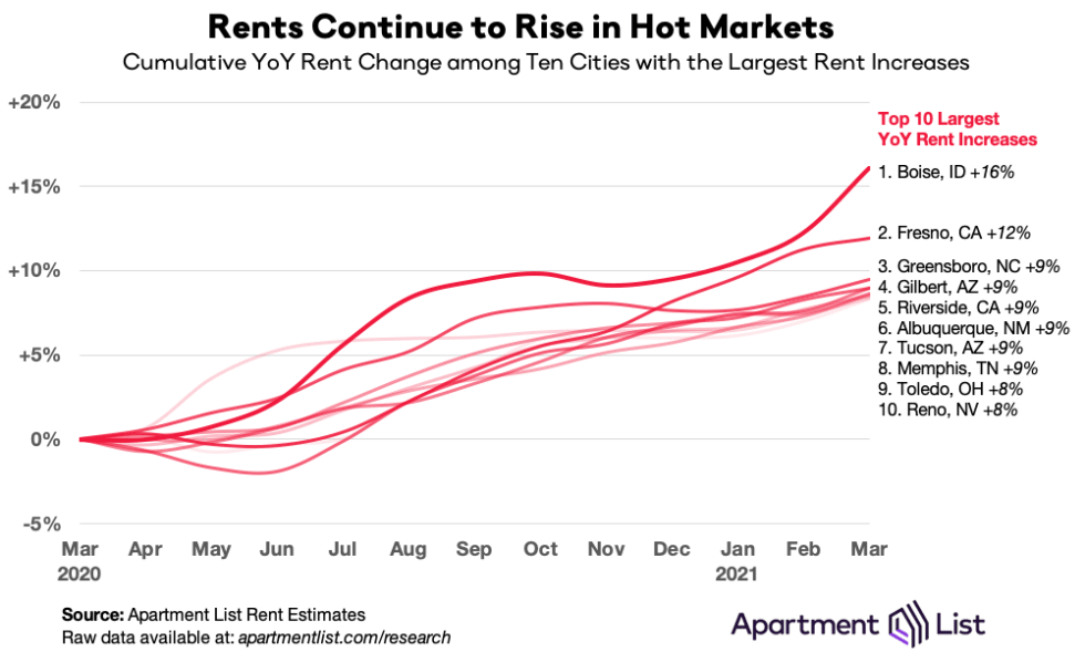 You don’t have to take Yardi’s word for it. The latest Apartment List National Rent Report showed a 1.1% annual increase for March, the largest increase since they began publishing their national rent index in 2017. With the latest improvement, year-over-year rent growth at the national level has now turned positive, eliminating the pandemic.